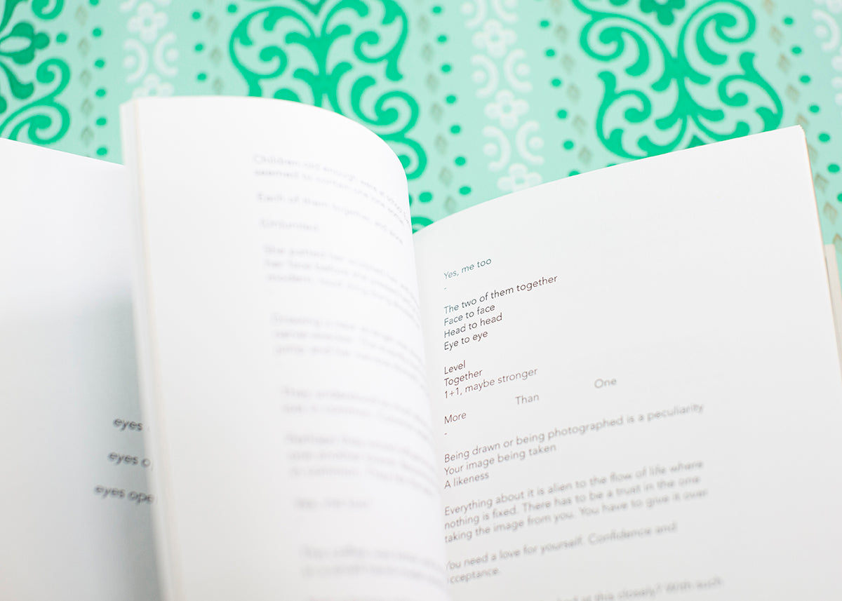 In the book an accompanying text imagines the act of these two women coming together, one to draw the other to sit. And contemplates ideas of unity, solidarity, the sisterhood and everyday forms of feminist action or resistance.